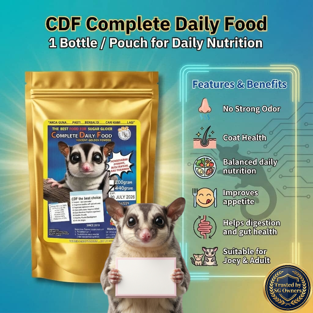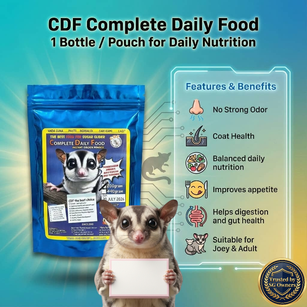 CDF Instant Golden Powder direka khas untuk memudahkan rutin pemakanan harian sugar glider, tanpa perlu mencampurkan pelbagai bahan tambahan.